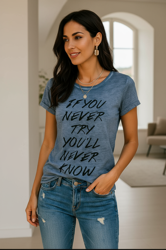 T-shirt Donna Blu Denim Cotone Made in Italy - Maglia Girocollo con Stampa Motivazionale